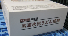這是一種非常薄,高彈性的日本烏龍麵名為冰見烏龍麵,位在富山縣冰見市。我們以前總是以原來乾燥麵條形式賣給消費者,但後來我們嘗試將乾燥麵條作成冷凍麵條以我們的技術經過我們控制和管理煮的時間,沸騰溫度,冷卻時間,冷卻溫度,冷卻方式,凍結時間,冷凍溫度和冷凍的方法。最後,我們可以提供美味的冷凍麵條給所有消費者和飯店,日本料理店等等。