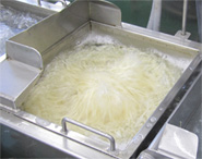 弊社では、この麺を弊社独自に編み出した方法で冷凍加工して、その弾力性(こし)・もちもち感・のどごしを